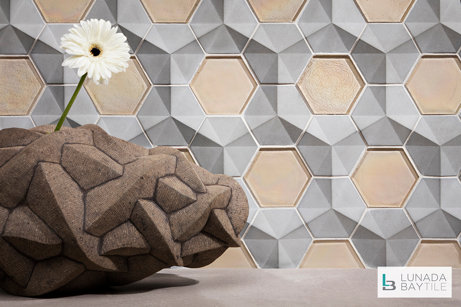 Playful and modern hexagon pattern of concrete and glass. The dimensional Fanfare Hex from our Contourz series in Grayce with Flux 4" Hex as glass color accents in Latte Pearl.