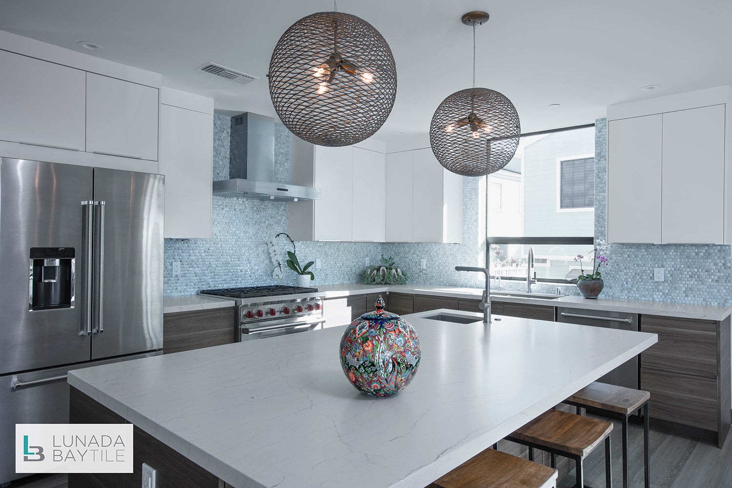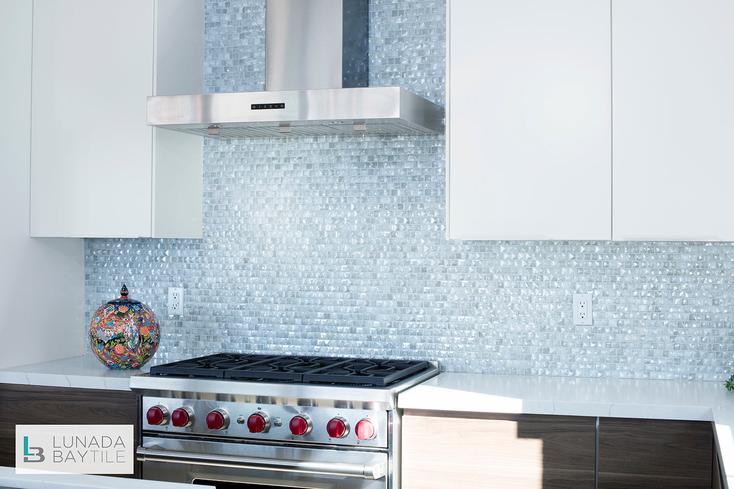 Beautiful kitchen in the Lucia Container House in Redondo Beach, CA features the three-dimensional Origami Mosaic Nami pattern in Ivory Pearl. The dimensional hand-crafted glass mosaics add to the texture and light within the room.