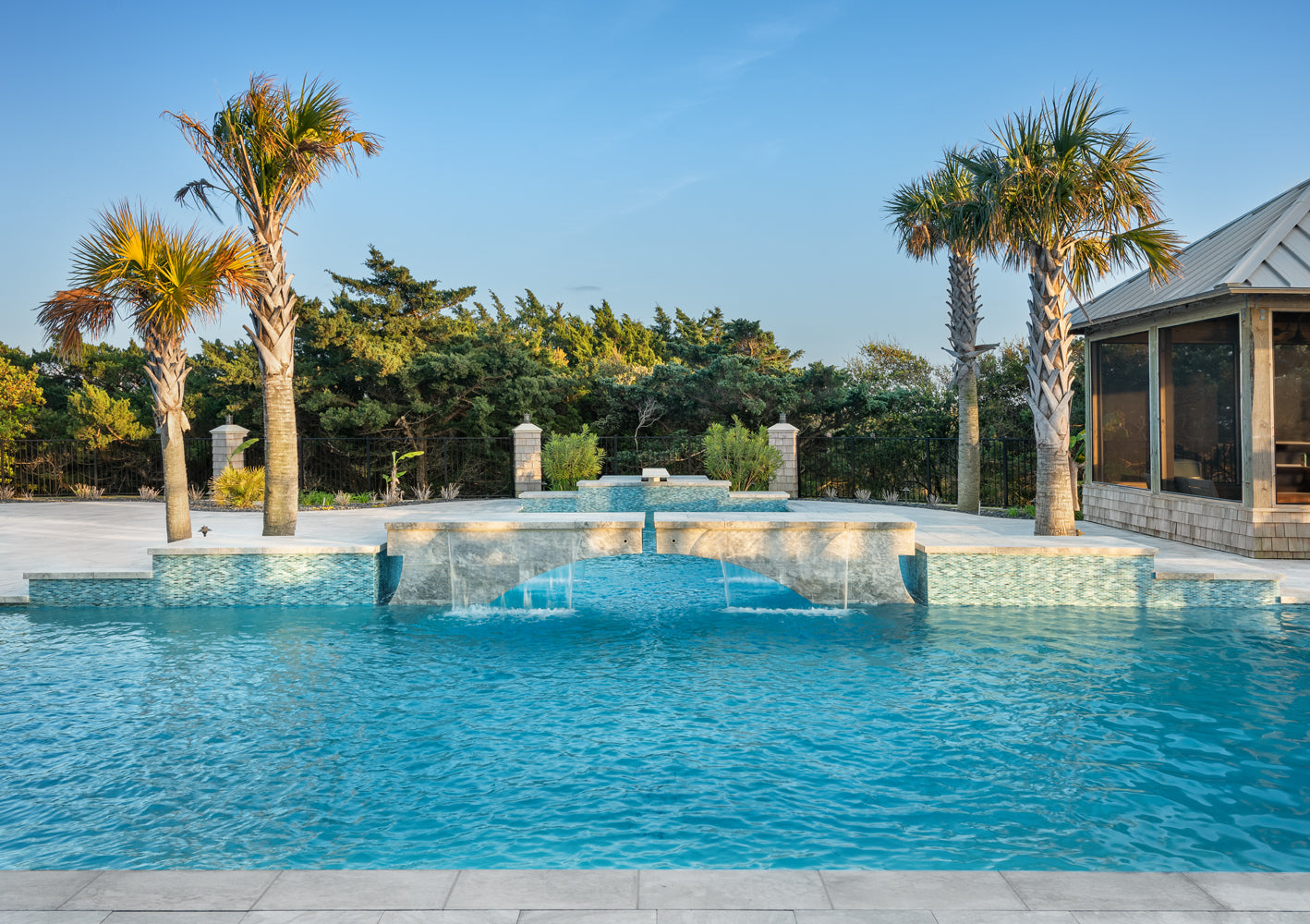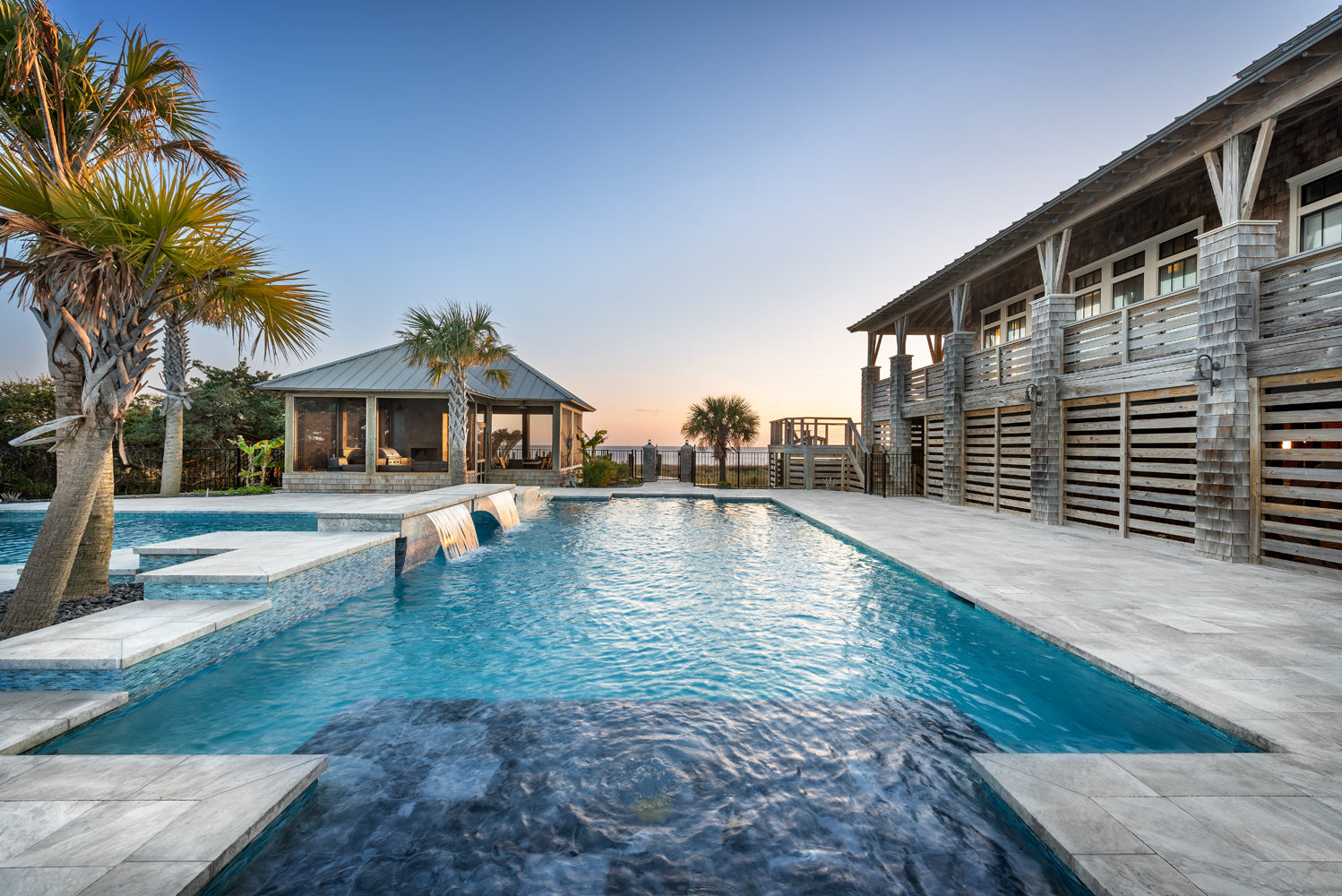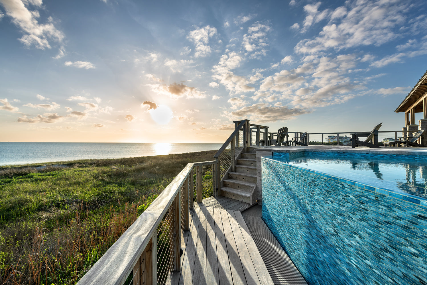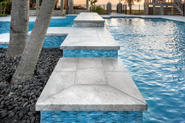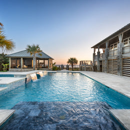 Whether you're taking a refreshing dip or lounging by the water, this enchanting retreat is a true celebration of nature’s artistry! The beautiful hand-crafted glass mosaics from our Agate series covering this pool and spa breathe life into this outdoor space. A delightful dance of blues and soft greys swirls within the glass perfectly capture the essence of coastal living by echoing the vibrant colors of the nearby ocean waters and the sky’s reflections on the pool's surface. Nestled throughout this Outer Banks, North Carolina home, the glass tiles harmonize beautifully with their nature-inspired colors and finishes, creating a serene oasis that invites you to relax, unwind, and soak in the beauty of the surroundings.