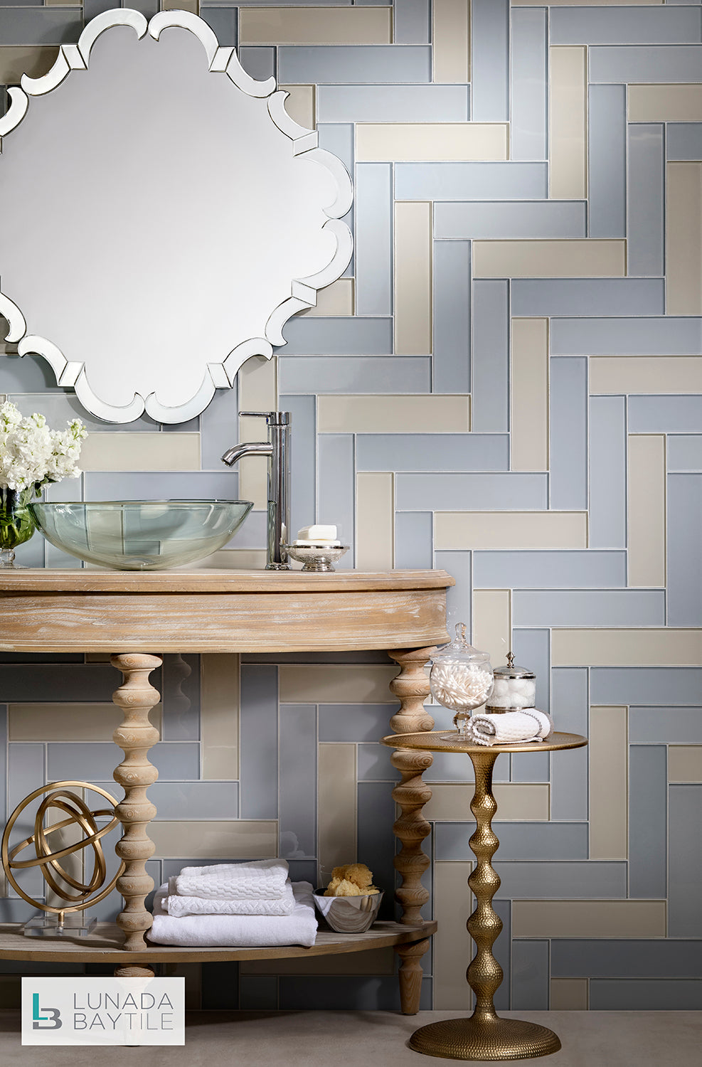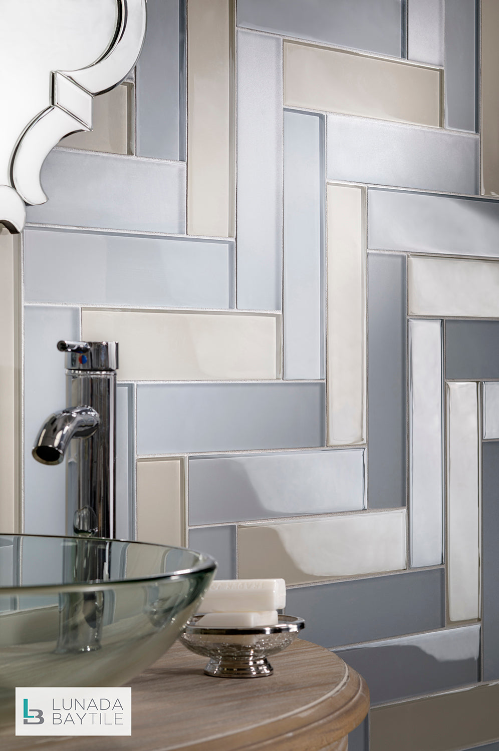 Tomei 3x12 in Linen Natural, Pumice Silk, Vapor Natural Blends shown together in a herringbone pattern.