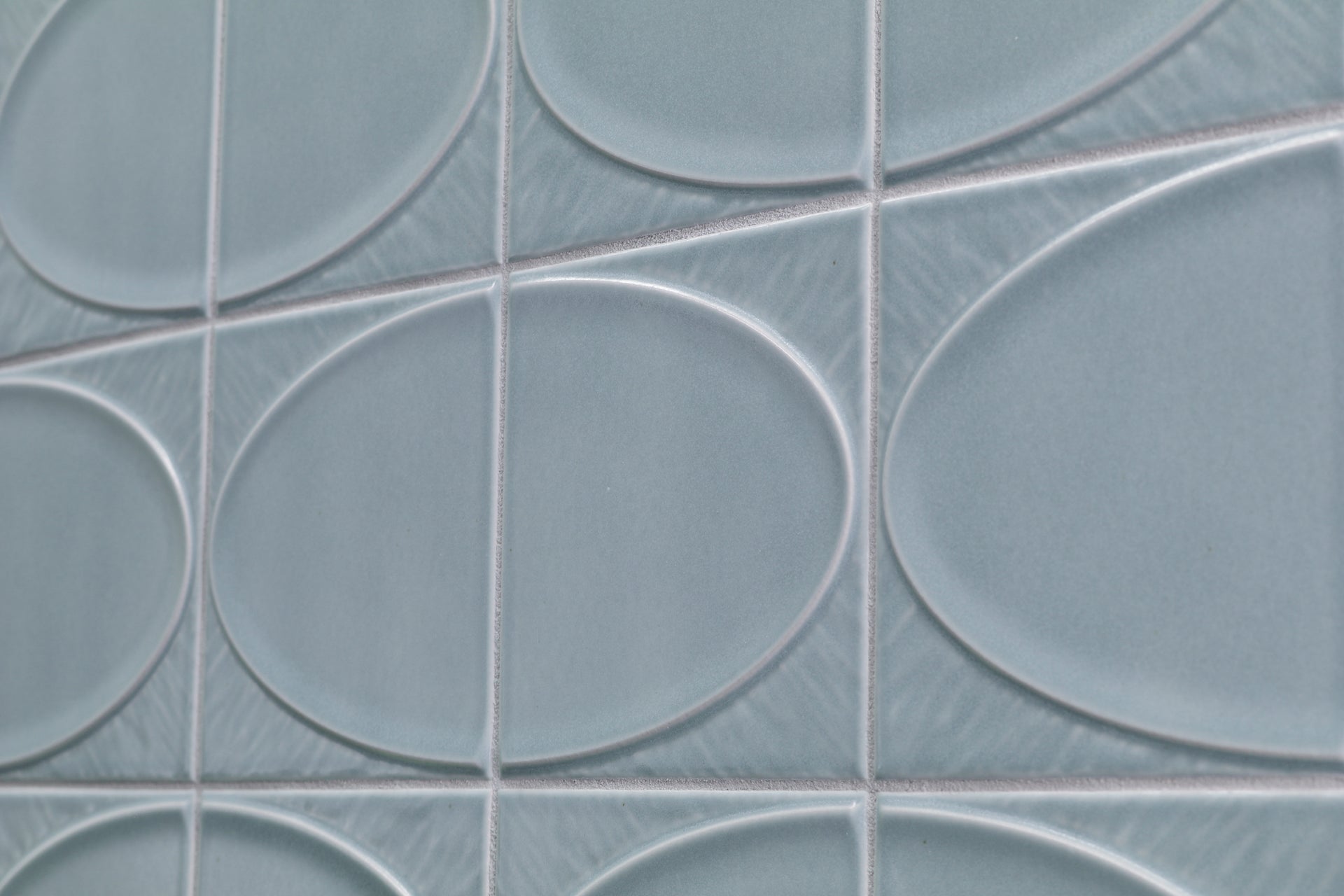 Beautifully arching semi-ellipse featuring three-dimensional relief and hand-sculpted texture. The square ceramic tiles can be installed in a variety of orientations and pattern combinations to create an even more personal expression.
