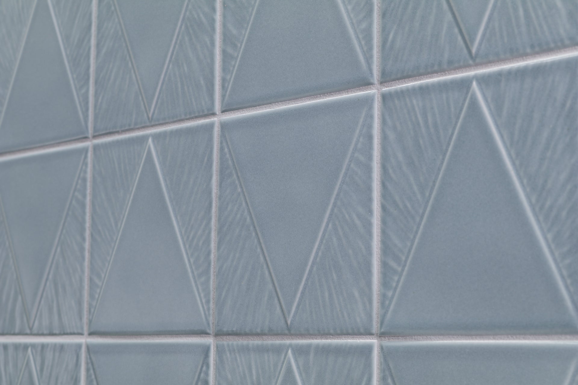Hand-crafted ceramic tiles featuring three-dimensional relief and hand-sculpted texture emulate a facet, gem cut, arrow, diamond shape and more depending on how they are arranged. The square ceramic tiles can be placed in a variety of orientations and pattern combinations to design an even more personal space.