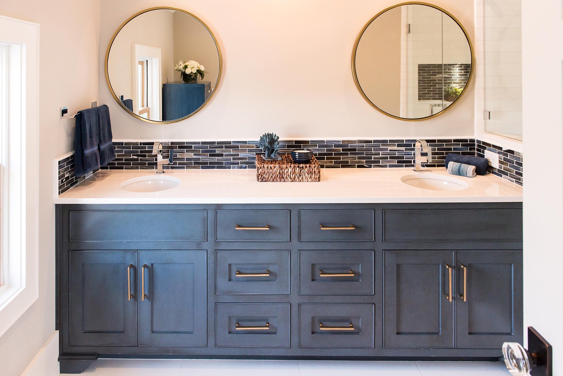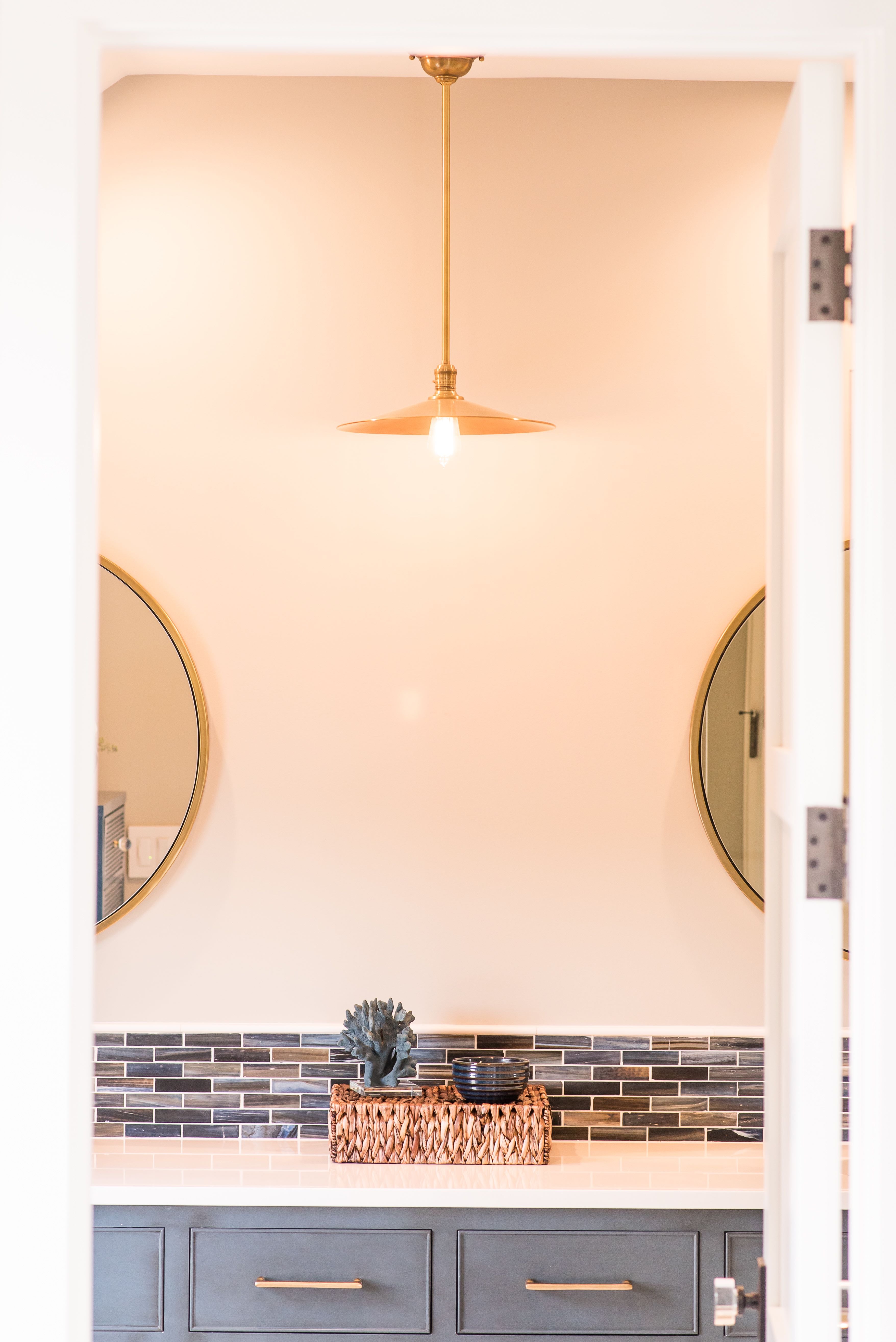 アブルッツォ シルクのメノウ 1x4 レンガは、シャワー ニッチのアクセントと化粧台のバックスプラッシュとして使用されています。