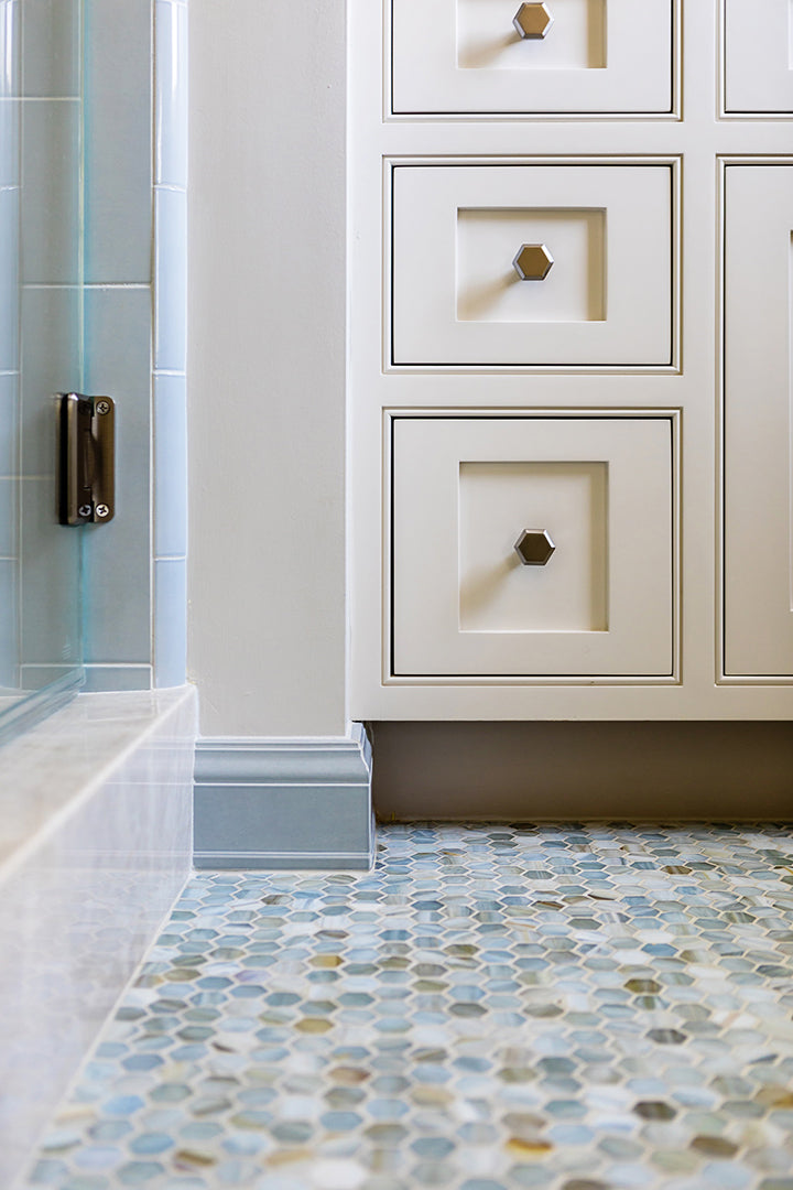 アゲート シリーズのルッカ シルクの 1 インチの六角形は、このバスルームの床にエレガントな表面を作り出します。