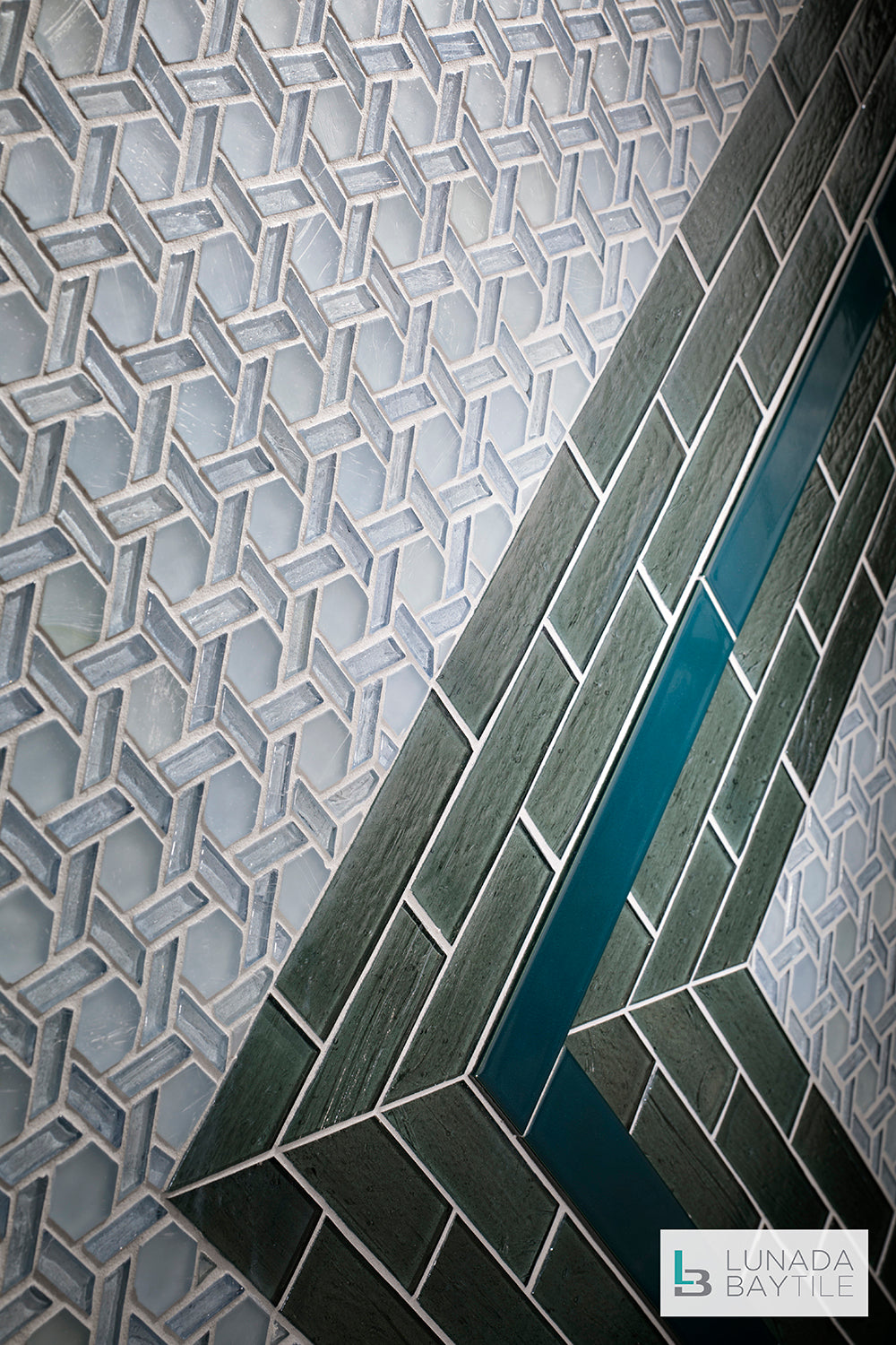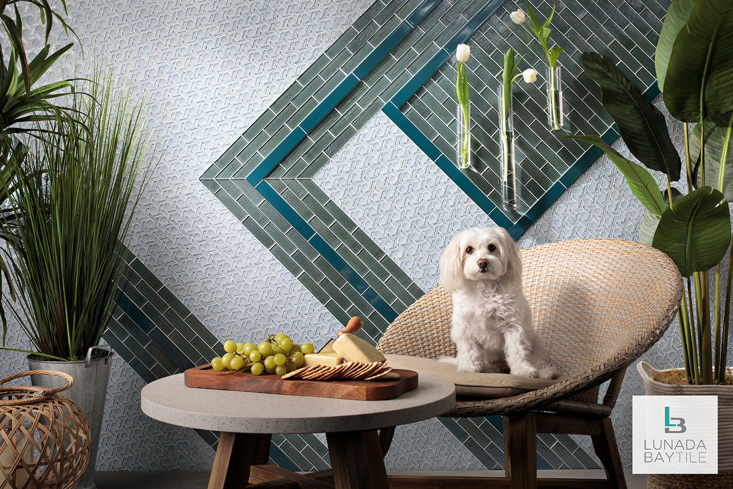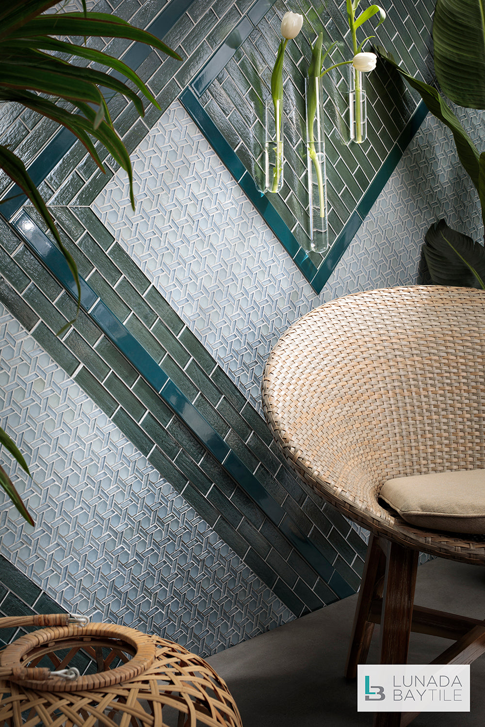 このフィーチャーウォールの作成には、Elements Cane H2O、1x3 Seaweed Pearl、Ka-nu Cruise Blue Liner が使用されました。