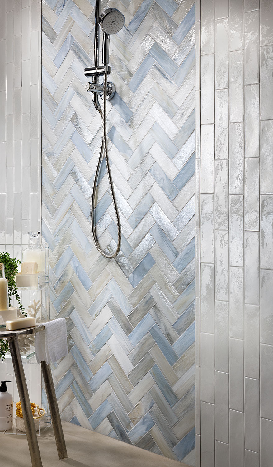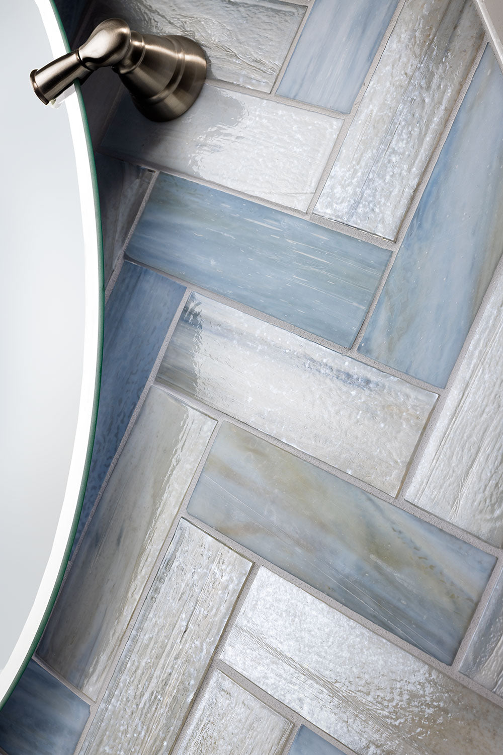 Hand-crafted 2x6” glass tiles transform this bathroom into a luxurious oasis through a stunning and harmonious blend of three different colors from our Agate series (Lucca, Matera and Torino) and two distinct finishes (Pearl and Silk). The pearlescent finish of the tiles brings vibrant pops of color and brightens the room, instantly elevating the ambiance while the matte/silk finish adds texture and dimension within the blend for a visually rich experience.