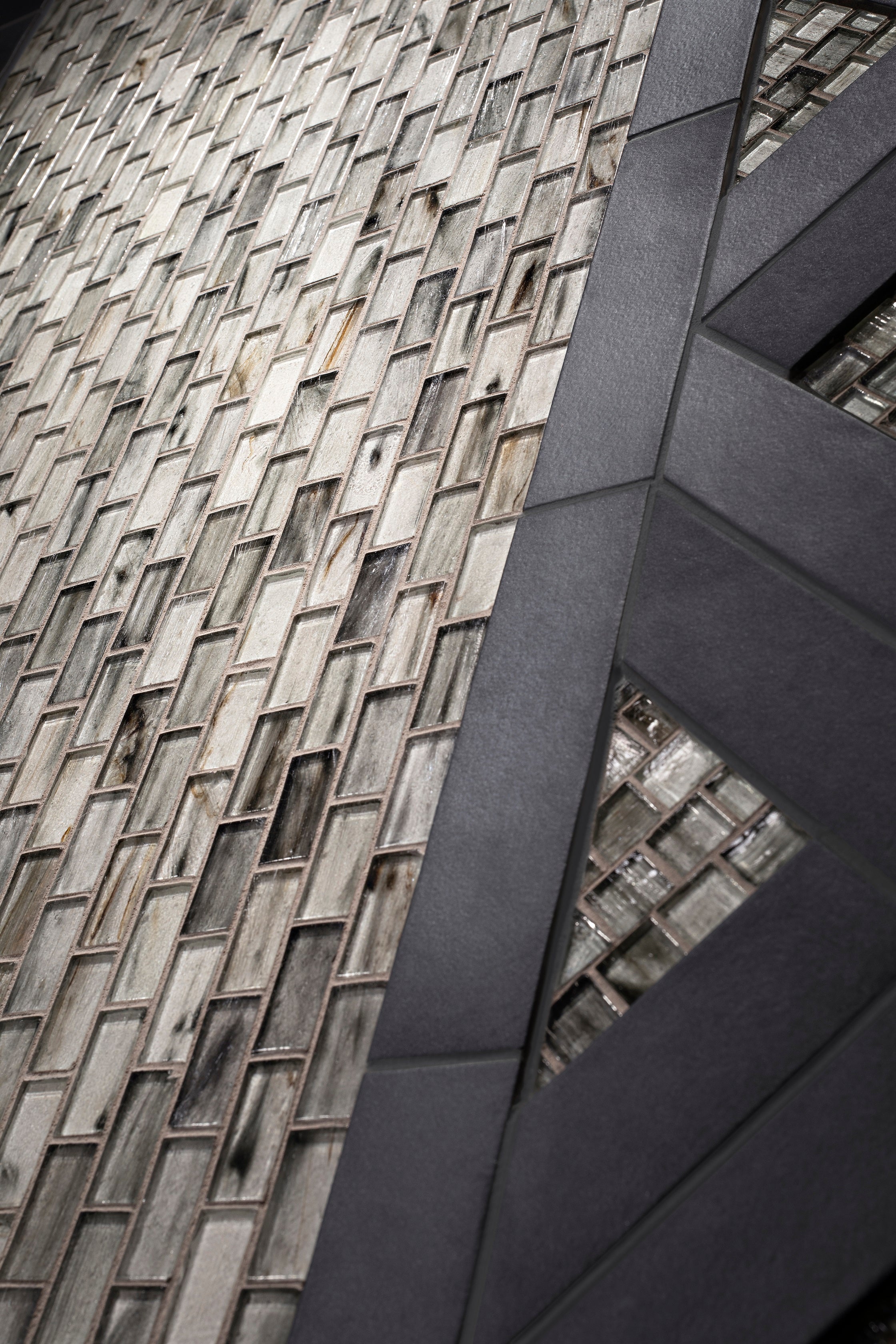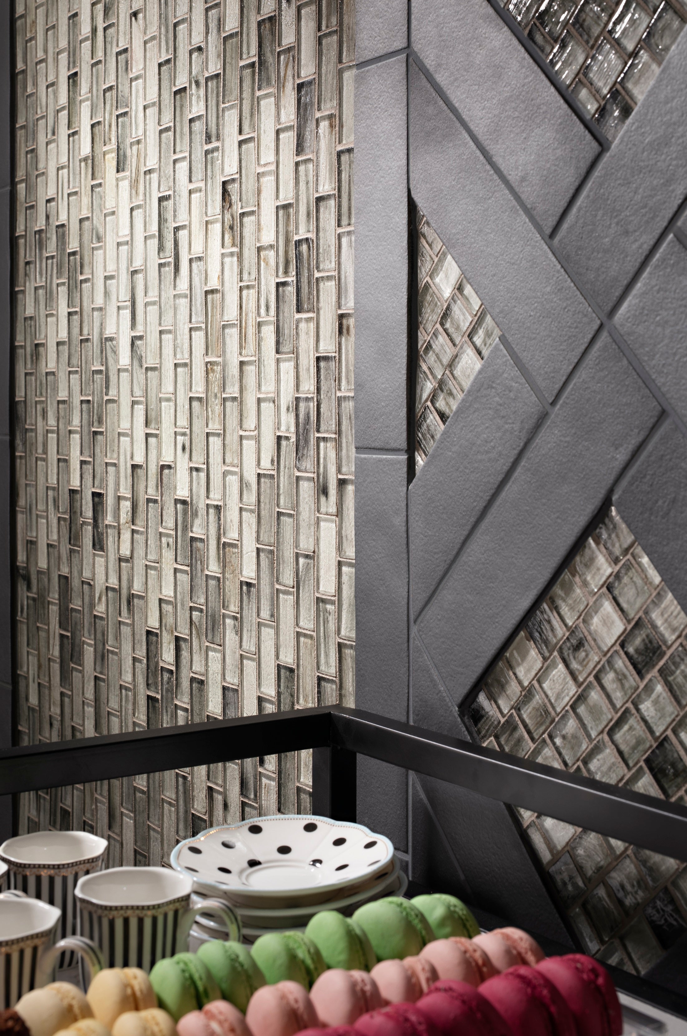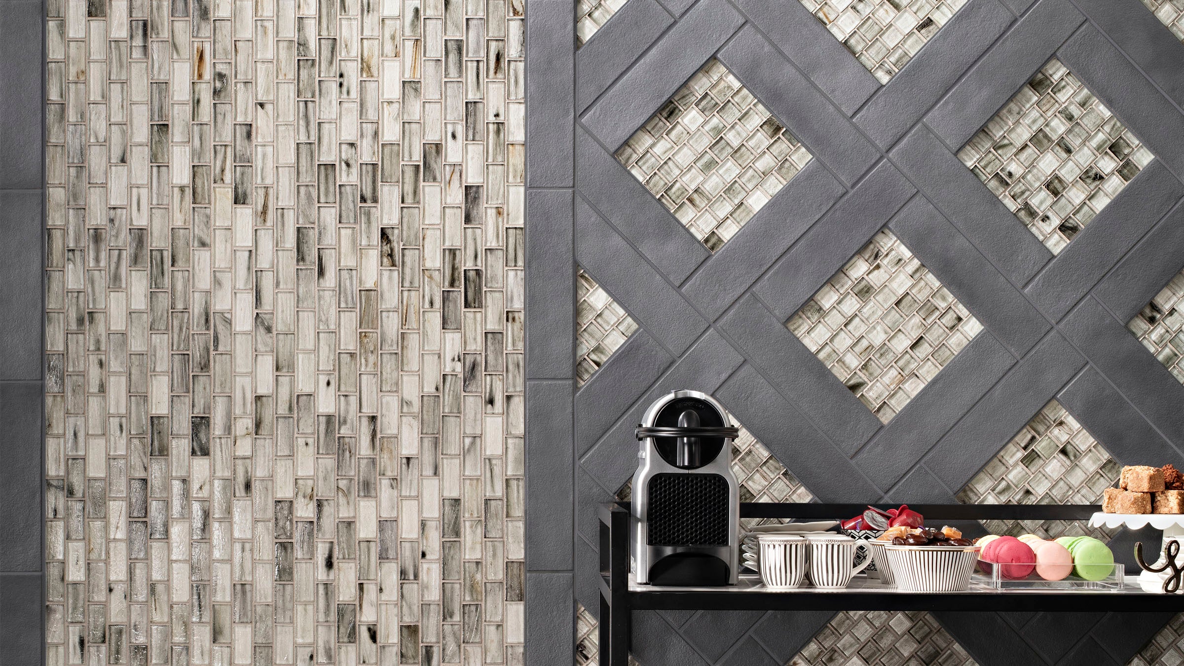 ハイセン 1x1 オフセットと 1x2 レンガ、スターライト ナチュラル、グラファイト 2-1/2 x 9-1/2 で格子パターンを作成します。