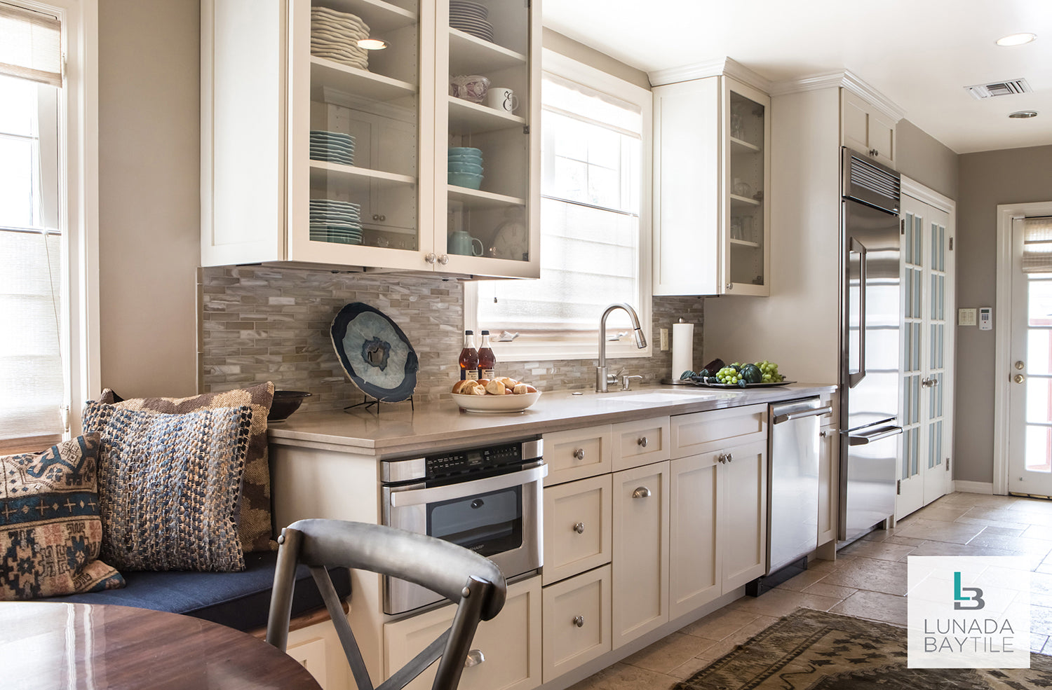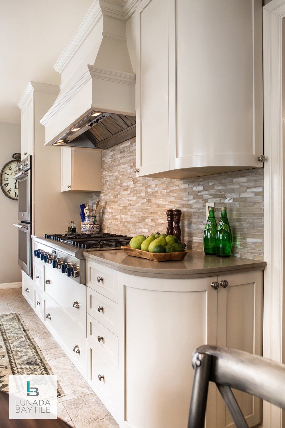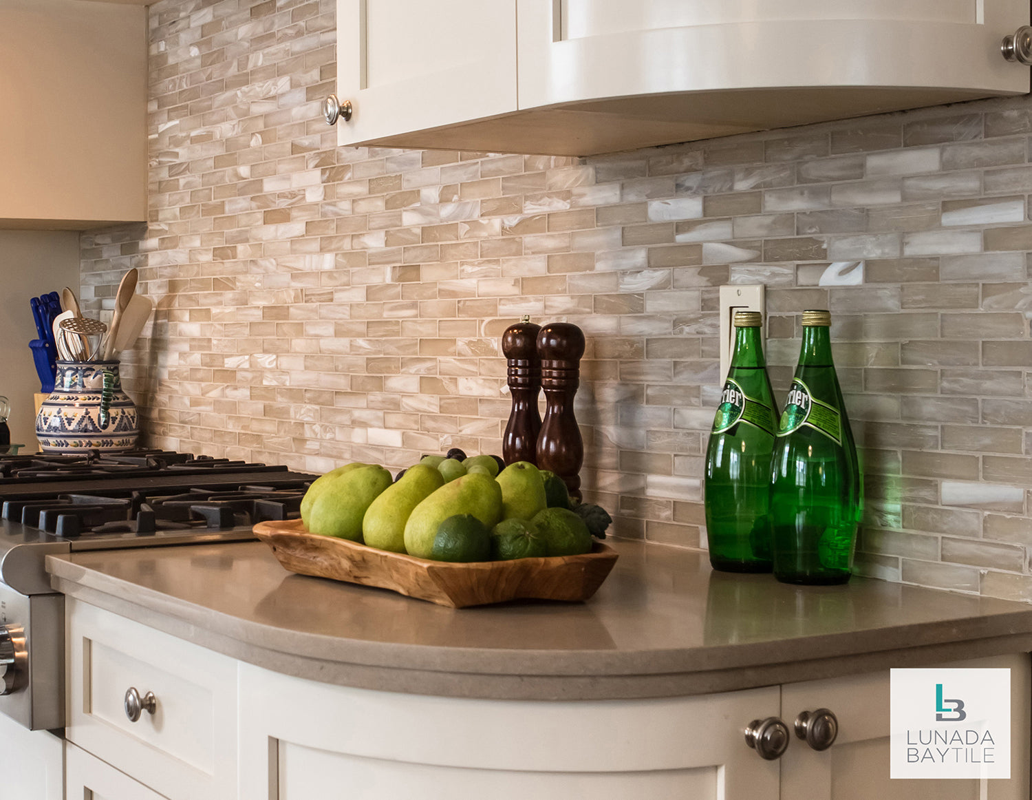 Shibui 1x4 Brick Buff Silk がキッチンのバックスプラッシュとして表示されています。