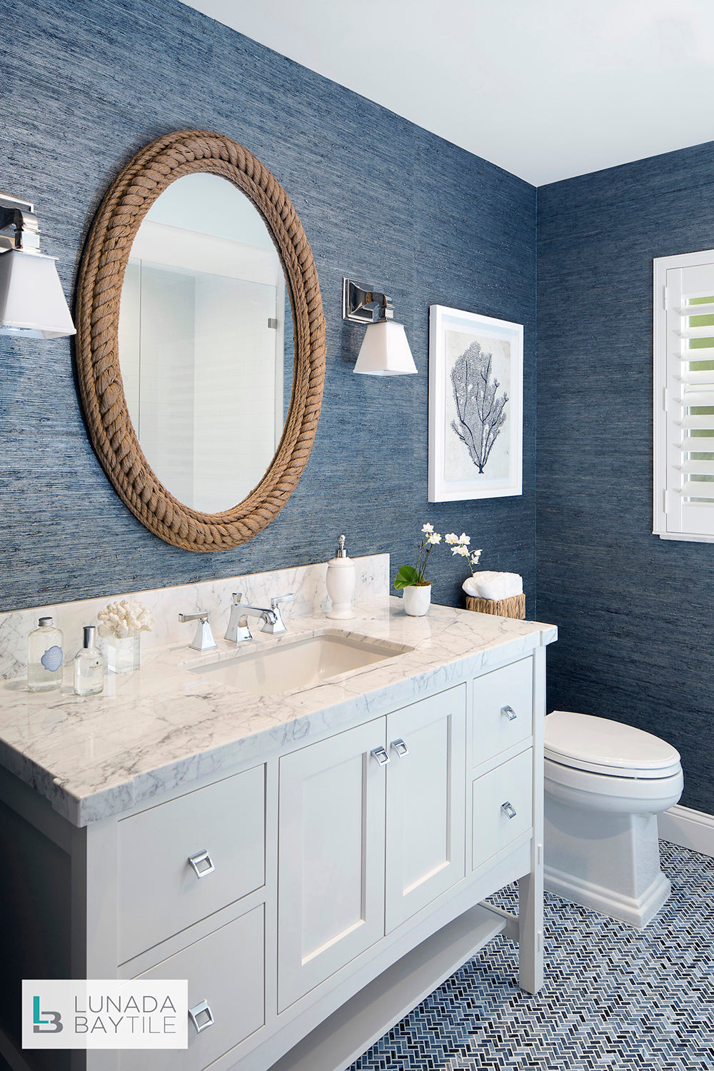 渋井 1/2x1 ヘリンボーン セーヴル ブルー シルクがゲスト用バスルームの床に展示されています。