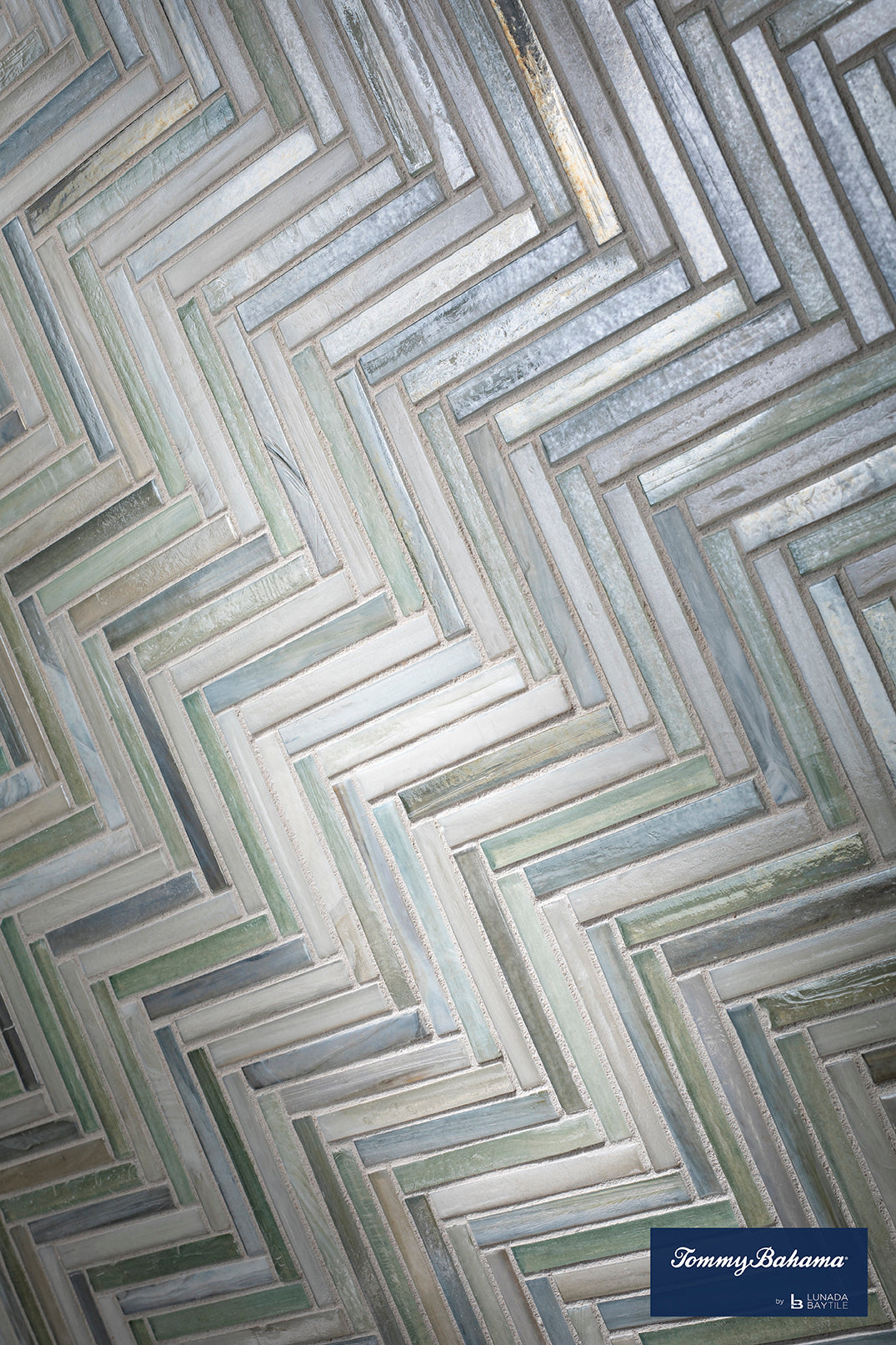 シャワーの壁にあるトミー バハマ グラス ブレンド ジグ&ザグ イン カヨココは、リラックスを促します。ささやくような柔らかさの白、青、水色、緑の組み合わせによって、この色のブレンドはあなたをこの休暇の目的地へと連れて行きます。